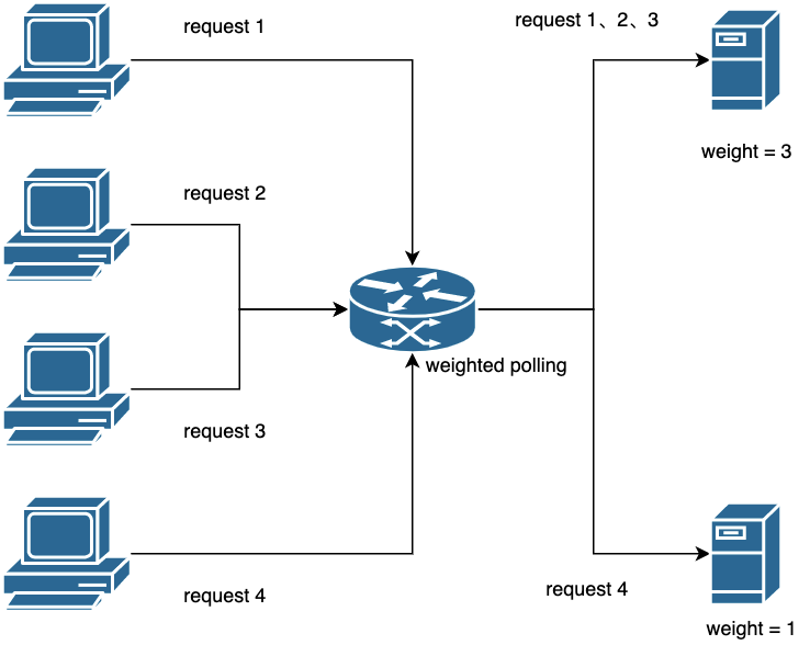 但是如果每个节点的处理能力不一样呢?虽然流量是均分的,但是由于中间有处理能力较弱的节点,这些节点仍然存在过载的可能性。于是我们就有了下面这种负载均衡算法。