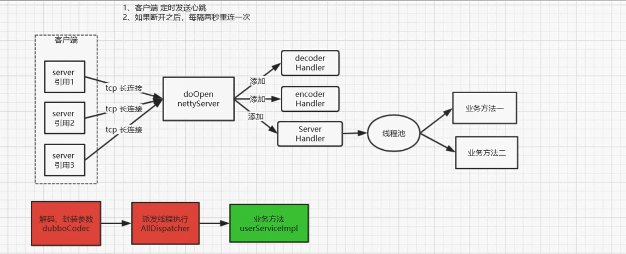 红色部分经过了一个线程池,RPC拿到数据后不能直接调用server的方法,必须要经过一个线程池。RPC协议服务端在进行反序列化,协议解码,网络传输,进行IO操作。如果IO线程去执行业务方法,业务方法本身需要做很多的操作,server的方法性能就非常的慢,导致RPC协议的IO线程,会被业务执行的逻辑堵塞,导致大量的客户端堵塞,最后链接挂了。