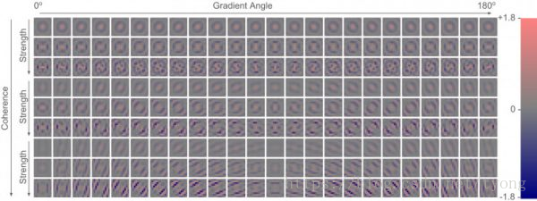 从左至右,学习得到的过滤器与处理后的边缘方向有选择性的呼应。举例来说,最底一行中间的过滤器最适合强水平边缘(90 度梯度角),并具有高黏性(直线的而非弯曲的边缘)。如果这个水平边缘是低对比度的,那么如同图中最上一行,另一个过滤器就被选择。