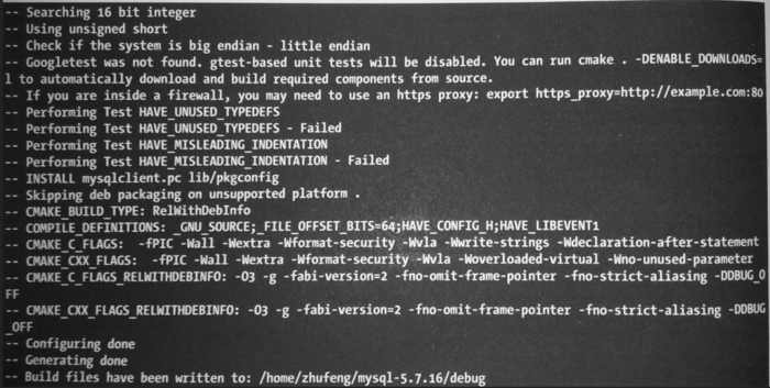 上面的命令中,有一点需要注意,因为当前所对应的相对目录为mysql-5.7.16/yuanma,而源码的目录为mysql-5.7.16,所以CMake命令指定源码目录为“ • •”,不然CMake找不到路径。
