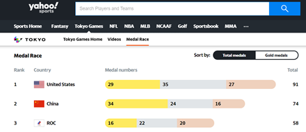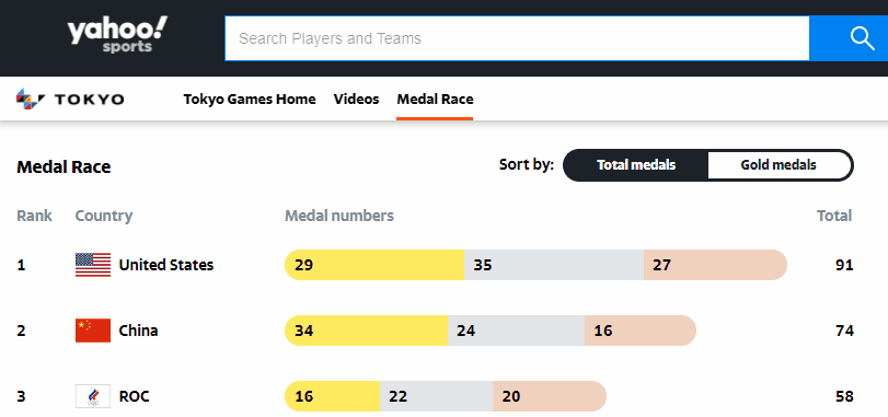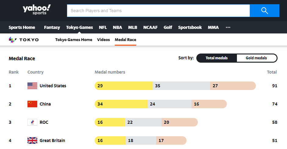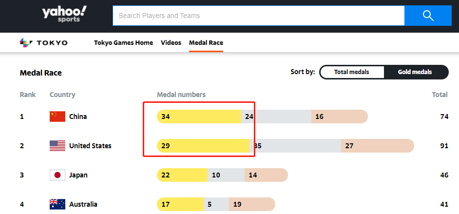 Yahoo 这张图最诡异的是什么?选择按照金牌总数排序,柱子只是换了位置,美国的29枚金牌那个金色柱比我们的34枚金牌还长就太离谱了。所以,这图到底是怎么画出来的?