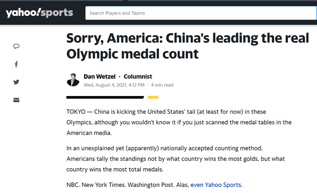 这件事情在reddit上讨论也很非常火热,美国自己人都看不下去了,专栏作家丹·韦策尔写了一篇文章《Sorry, America: China’s leading the real Olympic medal count》,有点美国人,你要自信的意思。