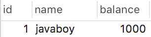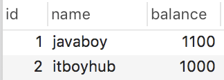 表的数据很简单,有 javaboy 和 itboyhub 两个用户,两个人的账户各有 1000 人民币。现在模拟这两个用户之间的一个转账操作。