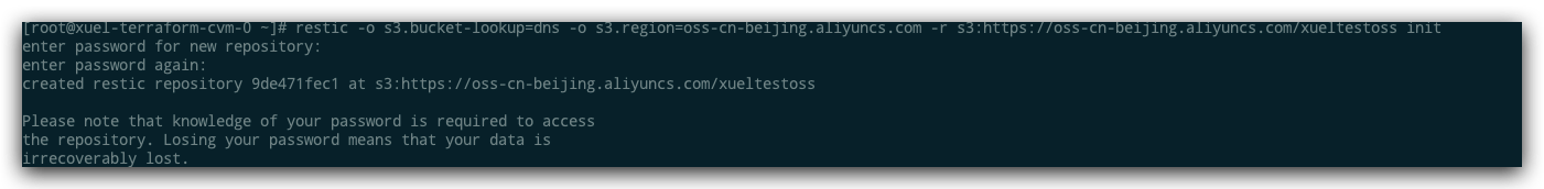 $ ./restic -o s3.bucket-lookup=dns -o s3.region=<OSS-REGION> -r s3:https://<OSS-ENDPOINT>/<OSS-BUCKET-NAME> init