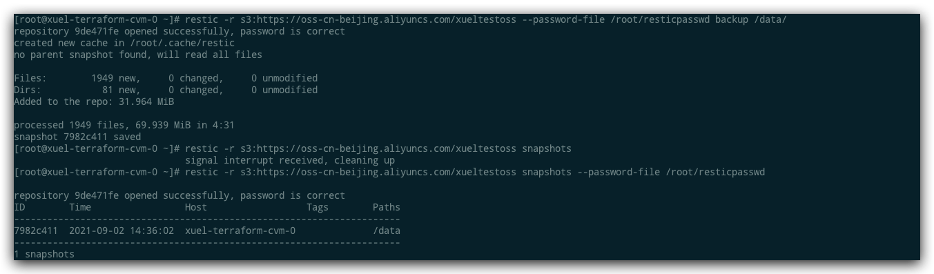 restic -r s3:https://oss-cn-beijing.aliyuncs.com/oss --password-file /root/resticpasswd backup /data/