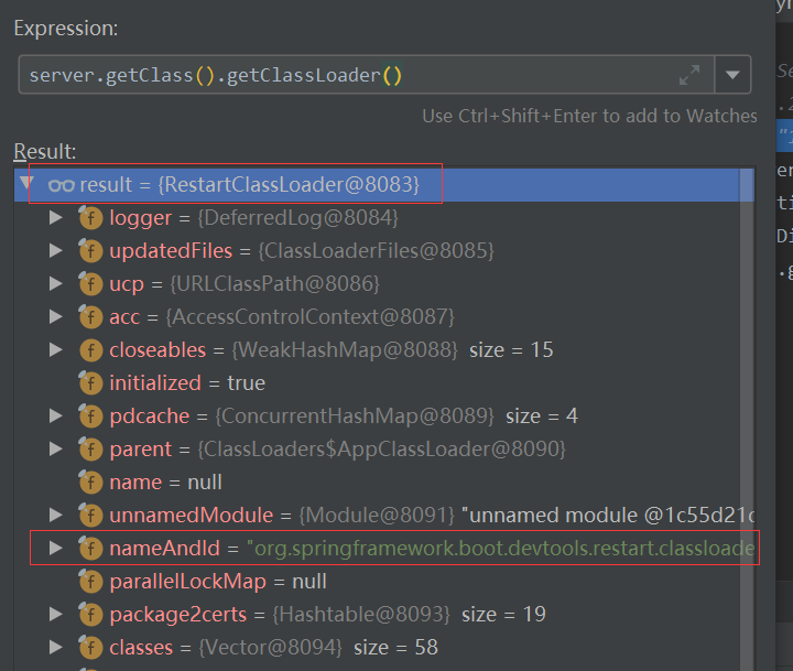 从图片就很容易看出来,server和MvpServer的类加载器不一样。server他这个类加载器是spring devtools这个包提供的。因此解决的思路就很简单,就查下项目中是否引入