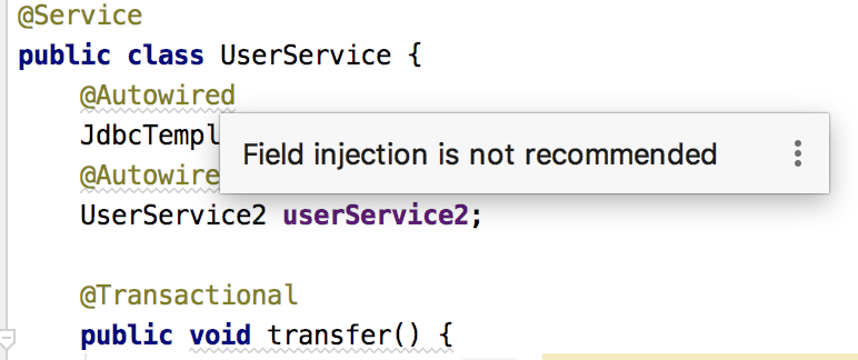 不过不知道小伙伴们有没有留意过,在 IDEA 里边,使用属性注入,会有一个警告⚠️: