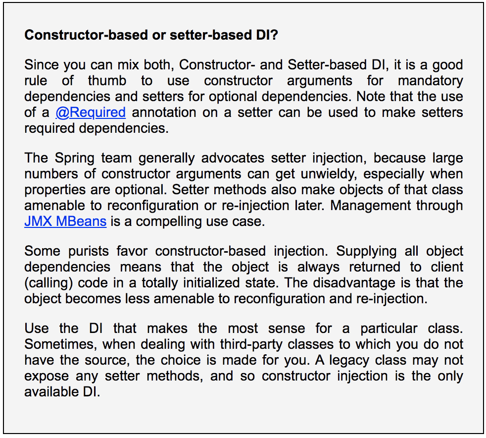 我们来看看 Spring4.x 的文档怎么说(https://docs.spring.io/spring-framework/docs/4.0.x/spring-framework-reference/htmlsingle/#beans-setter-injection):
