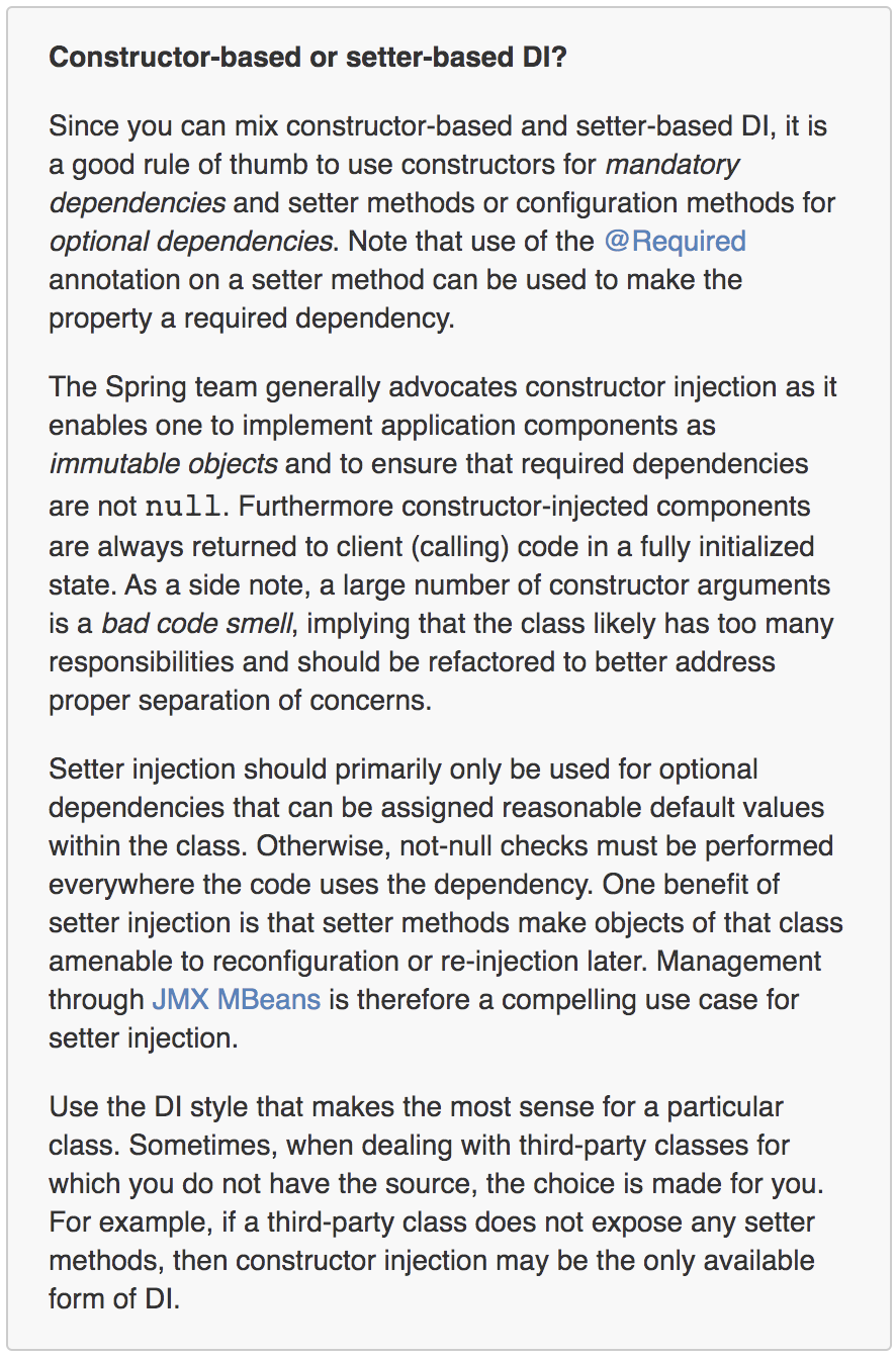 在 Spring3.0 文档中,官方说如果构造方法注入的话,属性太多可能会让代码变得非常臃肿,那么在 4.0 文档中,官方对这个说法也做了一些订正:如果用构造方法注入的时候,参数过多以至于代码过于臃肿,那么此时你需要考虑这个类的设计是否合理,这个类是否参杂了太多的其他无关功能,这个类是否做到了单一职责。
