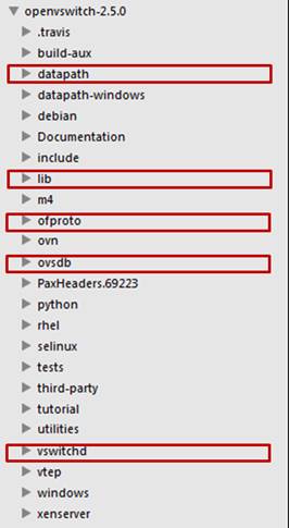 在如上的代码结构中,vswitchd中就是ovs-vswitchd的入口代码,ovsdb就是ovsdb-server的代码,ofproto即上述的中间抽象层,lib下面有netdev,dpif的实现,datapath里面就是内核模块openvswitch.ko的代码。