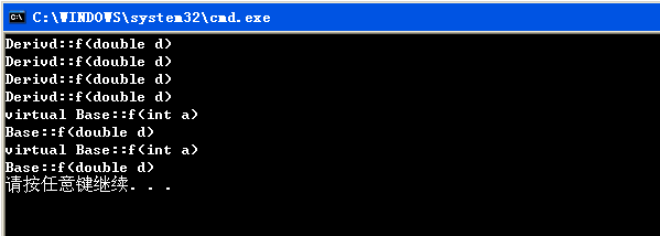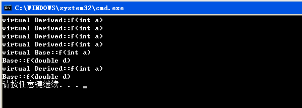 同理所有用子类对象或者子类指针来调用f()函数时,都只执行virtual void f(int a),输出virtual Derived::f(int a)