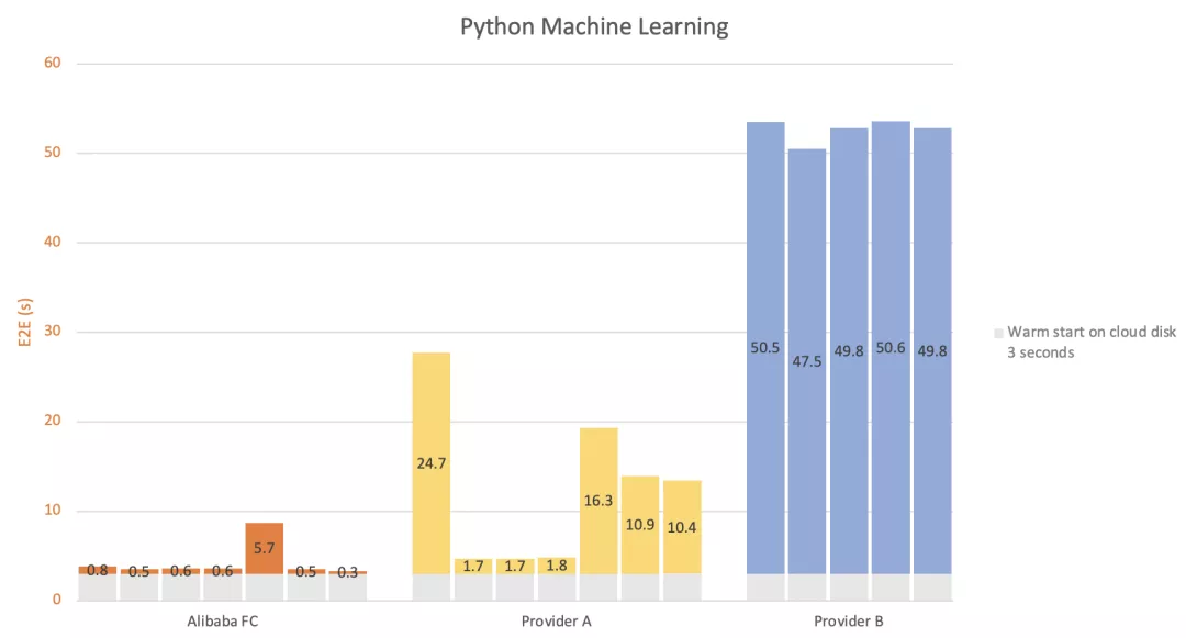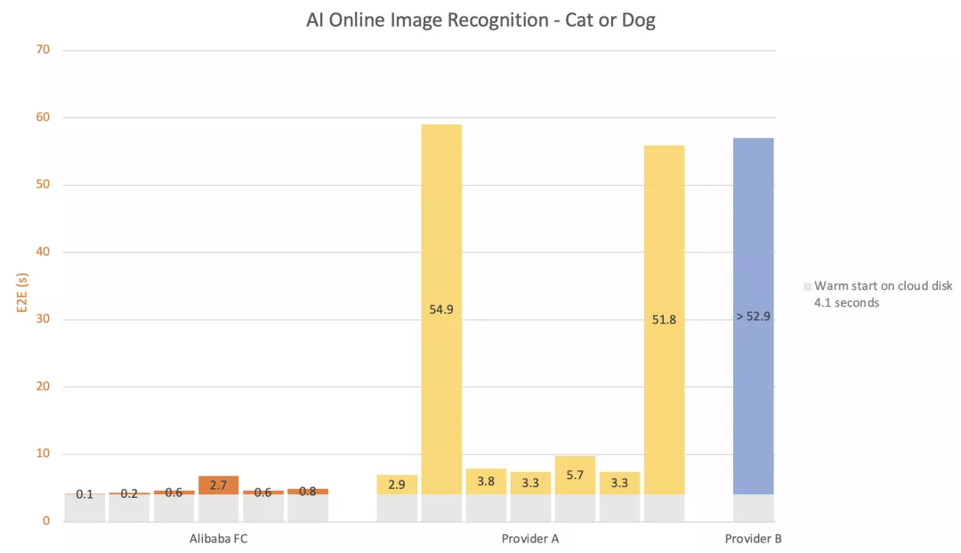 该镜像包含了基于TensorFlow深度学习框架的图像识别应用。阿里云函数计算和厂商A都能正常运行,但厂商A性能较差。厂商B则无法正常运行。下图中阿里云函数计算和厂商A的延时数据包含镜像拉取,容器启动,执行推理运算端对端的延时,而厂商B的数据只是拉取镜像部分的延时,都已经是最慢。FC相对稳定,可以看出函数计算在CPU消耗型如AI推理方面有着更大优势。