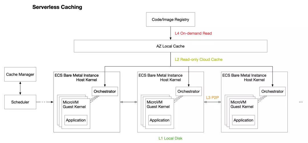 在设计下一代架构时我们不仅考虑解决冷启动频次问题,也同样注意到缓存对于启动时延的影响。于是我们创新性的发明了Serverless Caching,根据不同的存储服务特点构建数据驱动、智能高效的缓存体系,实现软硬件协同优化,将Custom Container体验进一步提升。函数计算后台神龙的更迭时间远大于ECS VM的闲置回收时间,对于用户侧而言,热启动频率大幅提升,在冷启动后,缓存会持续保留在神龙机器上,缓存命中率可达90%以上。
