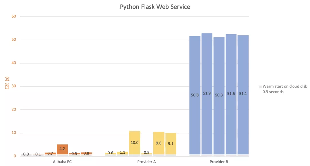 以云盘热启动为基准(灰色),对比各个厂商的额外开销(彩色)