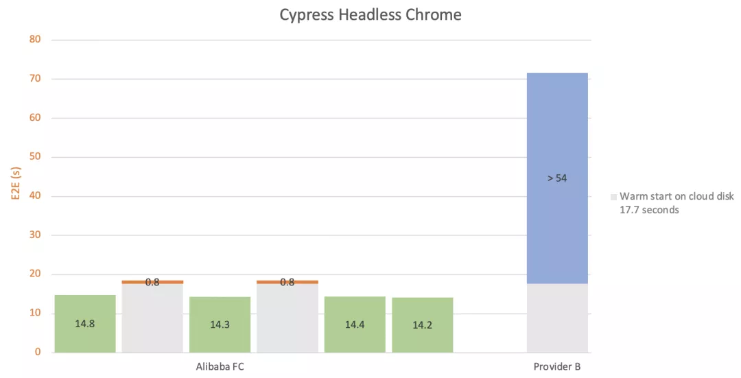 此镜像包含无头浏览器测试流程,厂商A由于编程模型限制和运行环境不兼容无法运行。而厂商B过慢只能在规定时间内耗时71.1秒完成应用初始化。不难看出函数计算在重I/O的镜像方面依然有着不错的表现。
