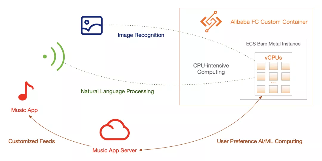 推理类计算依赖大体积底层训练框架以及大量的数据处理,普通的AI框架如Tensorflow的镜像可以轻松达到GB级,对CPU要求已经很高,要再满足扩缩容就更是挑战。函数计算自定义镜像可以很好的解决此类需求,用户只需直接使用底层训练框架镜像并与数据处理逻辑打包至新的镜像内便可以轻松省去更换运行环境所带来的移植开销,同时又可以满足弹性扩缩容带来的快速训练结果。歌曲喜好推理、图片AI识别分析等都可以无缝与函数计算衔接以达到弹性满足大量动态的在线推理请求。