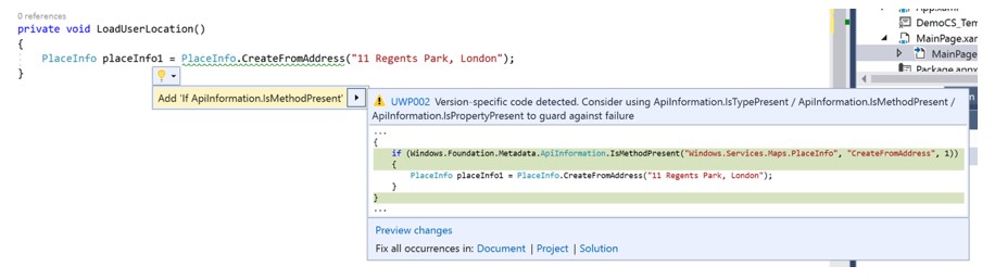 因为 UWP 开发需要指定最低平台,而且对不同的平台可以不同的 API ,以前只能通过看文档才知道现在有哪些API是可以使用的,现在可以安装Microsoft.Toolkit.Uwp.PlatformSpecificAnalyzer 来检查。这个库是一个 Roslyn 分析库,在编译时可以帮助检查是否使用了一些特殊平台才可以使用的接口。可以自动提示这个接口的平台,自动生成代码。