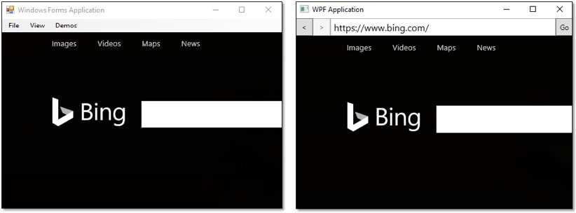 下面就是分别运行在 WinForms 和 WPF 的 WebViewControl 。使用新的 WebViewControl 可以支持 EdgeHTML 和流畅触摸,而且去掉很多 Internet Explorer 存在的坑。
