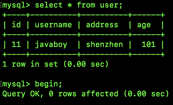 首先在 A 会话中查看当前 user 表,查看完成后开启事务: