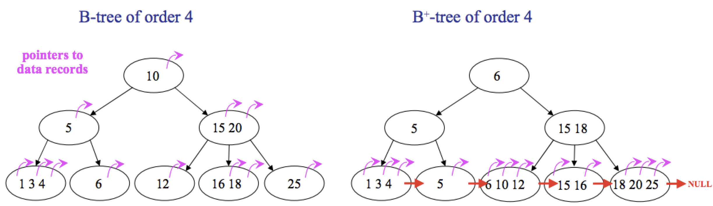 前面是 B-Tree,后面是 B+Tree,两者的区别在于: