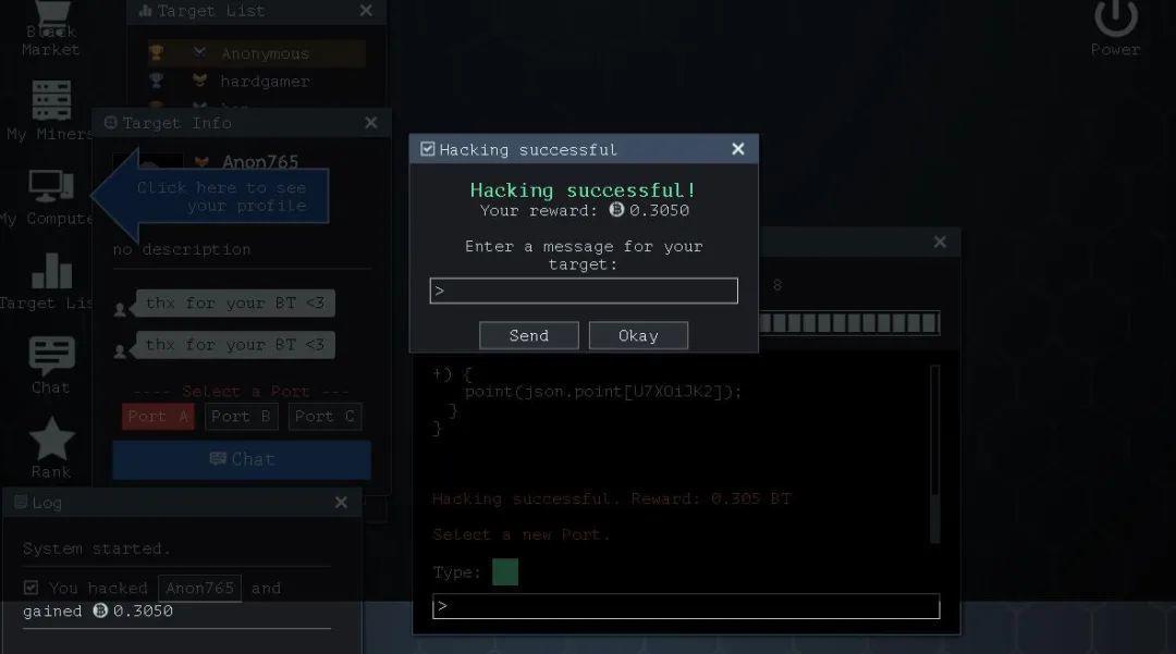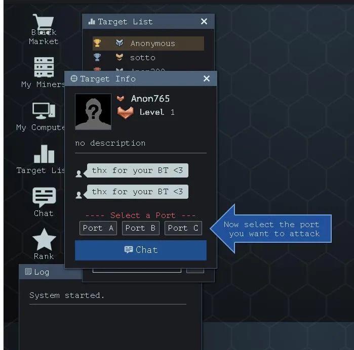 这个时候你可以选择发送下消息调侃下机器人,然后我们要输入黑客命令,选择Hack,然后选择端口,如图: