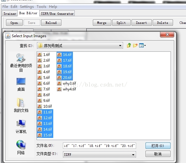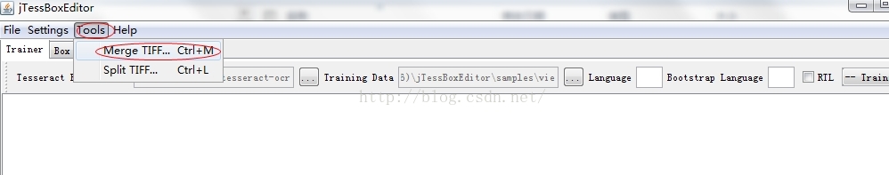 1、打开 jTessBoxEditor,选择tools->merge tif ,选择 tif图片,生成一个 格式为tif的 图片集