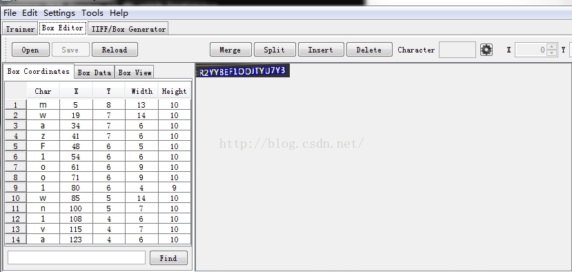 用 jTessBoxEditor打开生成的图片集why4.tif ,注意 why4.tif 对应的box文件一定要和他处于同一个文件夹下(请保持文件名),否则,用jTessBoxEditor打开没有 位置、识别结果等信息,然后就可以调整了,调整完之后保存