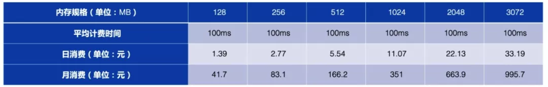 通常情况下程序所消耗的时间可能会与内存规格、程序本身所处理的业务逻辑有关。流量费用与程序本身和客户端交互的数据包大小有关,所以在这三个常见的指标,可能因为配置不规范导致计费出现比较大偏差的就是内存规格。以阿里云函数计算为例,我们假设有一个 Hello World 的程序,每天都会被执行 10000 次,可以统计不同规格的实例所产生的费用(不包括网络费用):