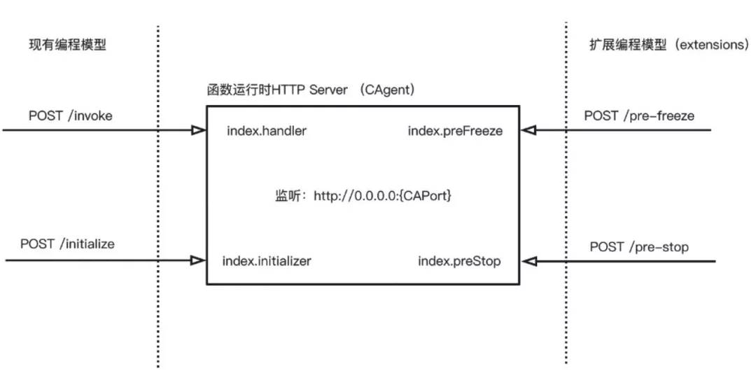 根据这些痛点发布了运行时扩展(runtime extensions)功能。该功能在现有的 HTTP 服务编程模型上扩展,在已有的 HTTP 服务器的模型中增加了 PreFreeze 和 PreStop webhooks。扩展开发者实现 HTTP handler,监听函数实例生命周期事件,如下图所示: