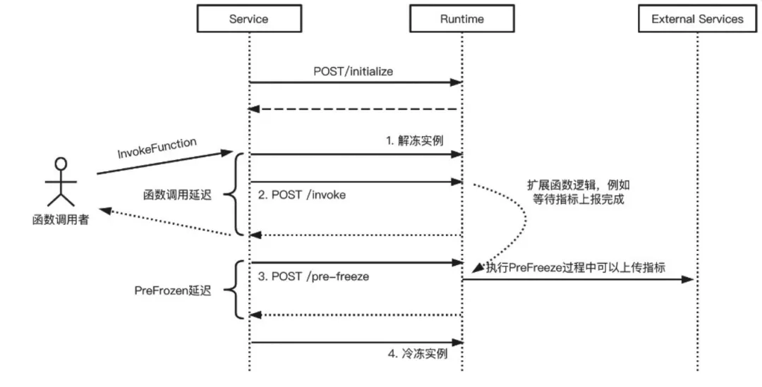 - PreFreeze:在每次函数计算服务决定冷冻当前函数实例前,函数计算服务会调用 HTTP GET /pre-freeze 路径,扩展开发者负责实现相应逻辑以确保完成实例冷冻前的必要操作,例如等待指标发送成功等。函数调用 InvokeFunction 的时间不包 PreFreeze Hook 的执行时间。