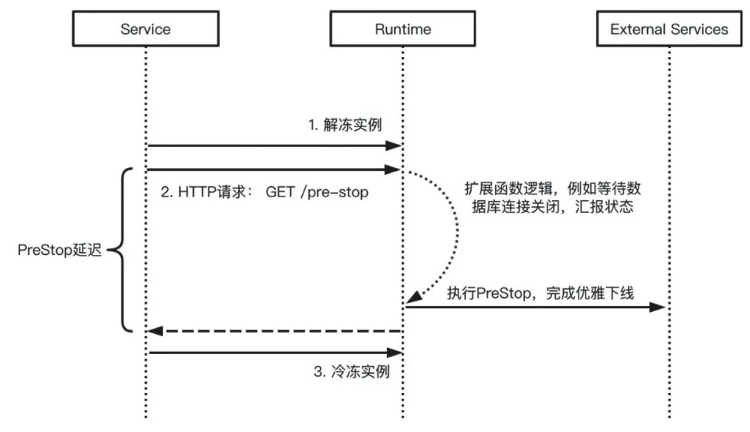 - PreStop:在每次函数计算决定停止当前函数实例前,函数计算服务会调用 HTTP GET /pre-stop 路径,扩展开发者负责实现相应逻辑以确保完成实例释放前的必要操作,如关闭数据库链接,以及上报、更新状态等。