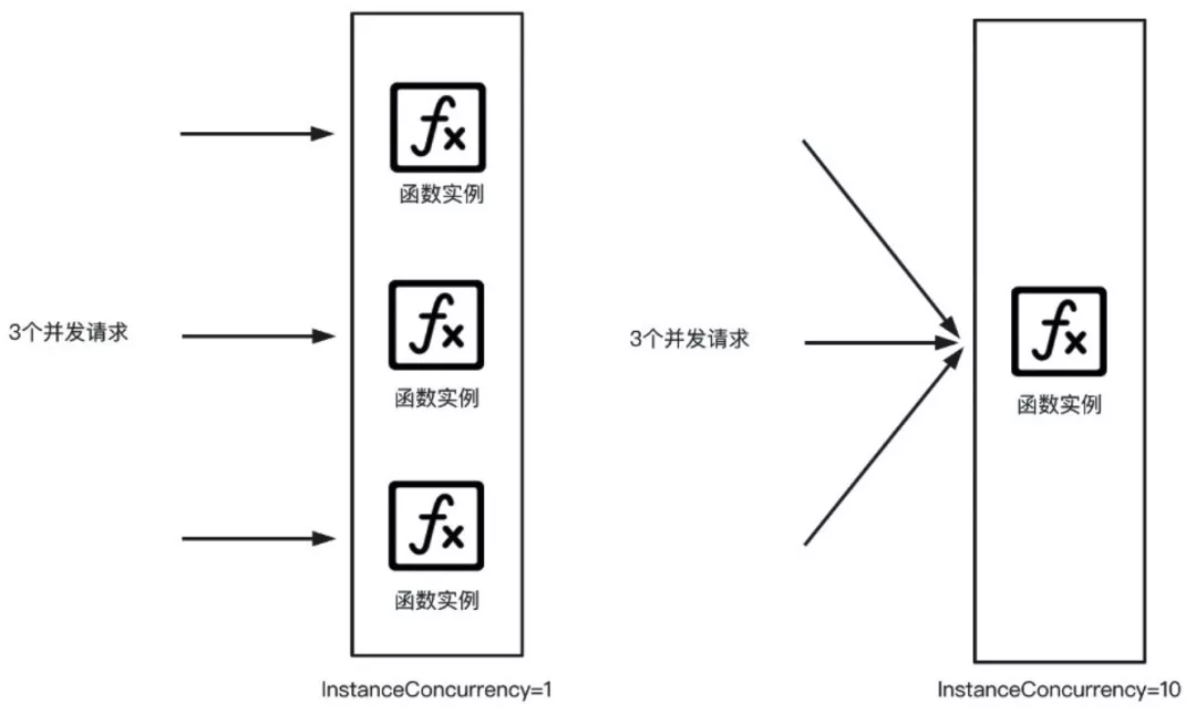 如图下图,假设同时有 3 个请求需要处理,当实例并发度设置为 1 时,函数计算需要创建3个实例来处理这 3 个请求,每个实例分别处理 1 个请求;当实例并发度设置为 10 时(即 1 个实例可以同时处理 10 个请求),函数计算只需要创建 1 个实例就能处理这 3 个请求。