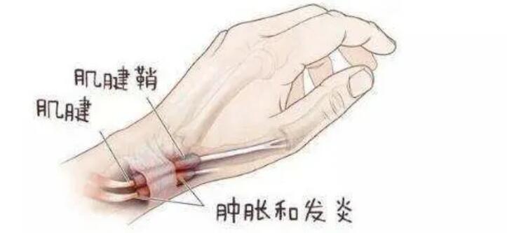 手腕部腱鞘炎,医学名称是“桡骨茎突狭窄性腱鞘炎”。在腕部的桡侧,也就是大拇指的一侧,可摸到一个骨性隆起,称为桡骨茎突。在桡骨茎突部位有两根肌腱通过(拇短伸肌腱与拇长展肌腱),这两根肌腱都走向拇指,参与拇指的活动。在手腕部这两根肌腱的外周,存在套管样的结构包裹肌腱,如同宝剑的鞘一样,就是腱鞘了。当手腕部经常处于重复性或持续用力的状况,会令肌腱与腱鞘间产生过度的摩擦与劳损,导致局部发生无菌性炎症,腱周充血肿胀,腱鞘内压力增加,腱鞘反应性增厚。出现这种情况后,任何需要手腕部这两根肌腱滑动或用力的动作,都会引起手腕桡侧剧烈的疼痛。