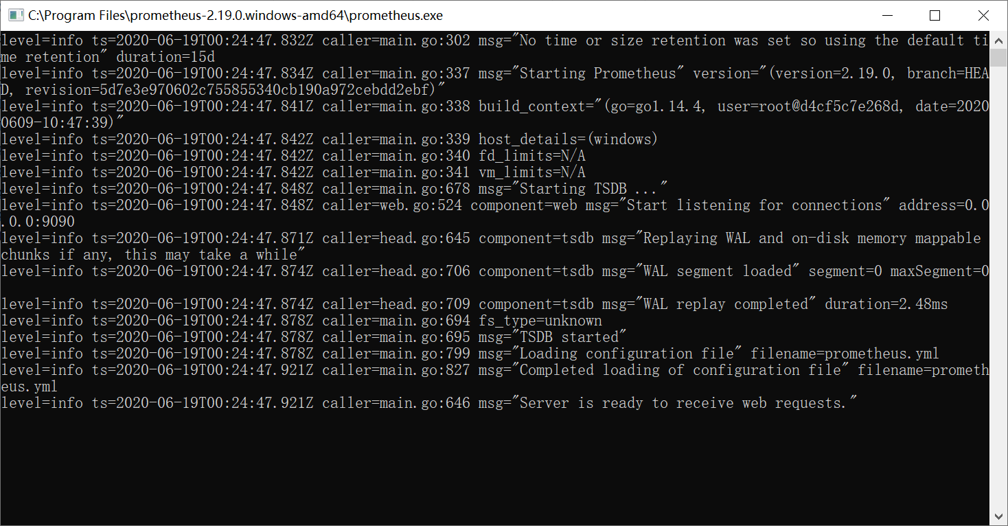 暂且不做修改,双击prometheus.exe即可启动,如下图: