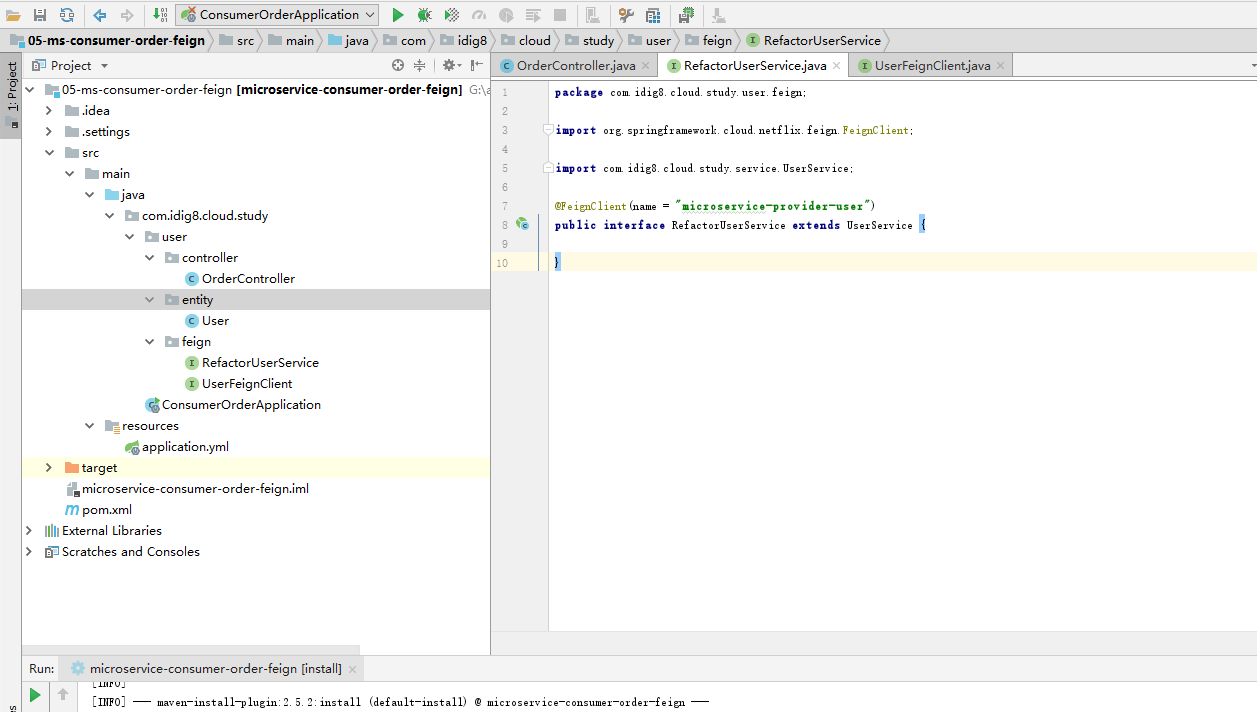 - 在订单服务里增加接口UserService的子接口RefactorUserService,并在子接口上加注解@FeignClient
