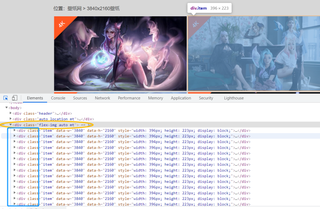 ),下面每一个div就对应一张高清壁纸;然后每页div标签里面的壁纸图片数据的各种信息:1.链接;2.名称;下面是xpath的解析;
