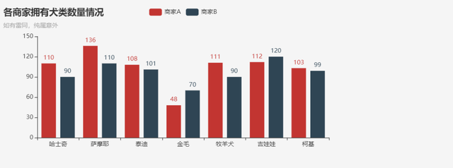title_opts=opts.TitleOpts(title='各商家拥有犬类数量情况', subtitle='如有雷同,纯属意外')