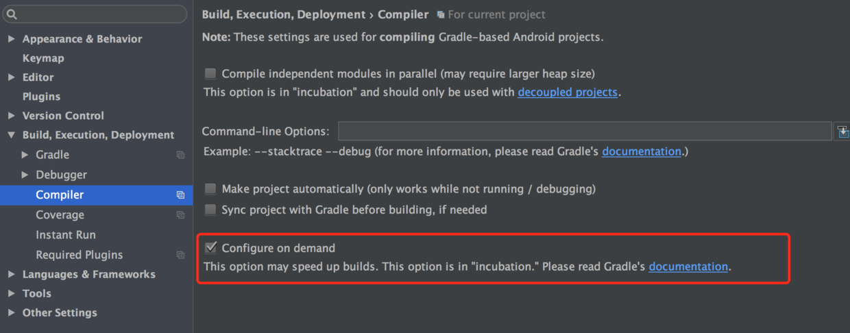 为了让Gradle能够确切的知道该如何构建你的APP,在每次构建之前,构建系统配置工程的所有modules和其他依赖(即使你只想构建或者测试一个modules),这使得大型的多module 工程的构建速度变得很慢。告诉Gradle仅仅配置你想要构建的Modules,用如下步骤使 on demand 配置可用