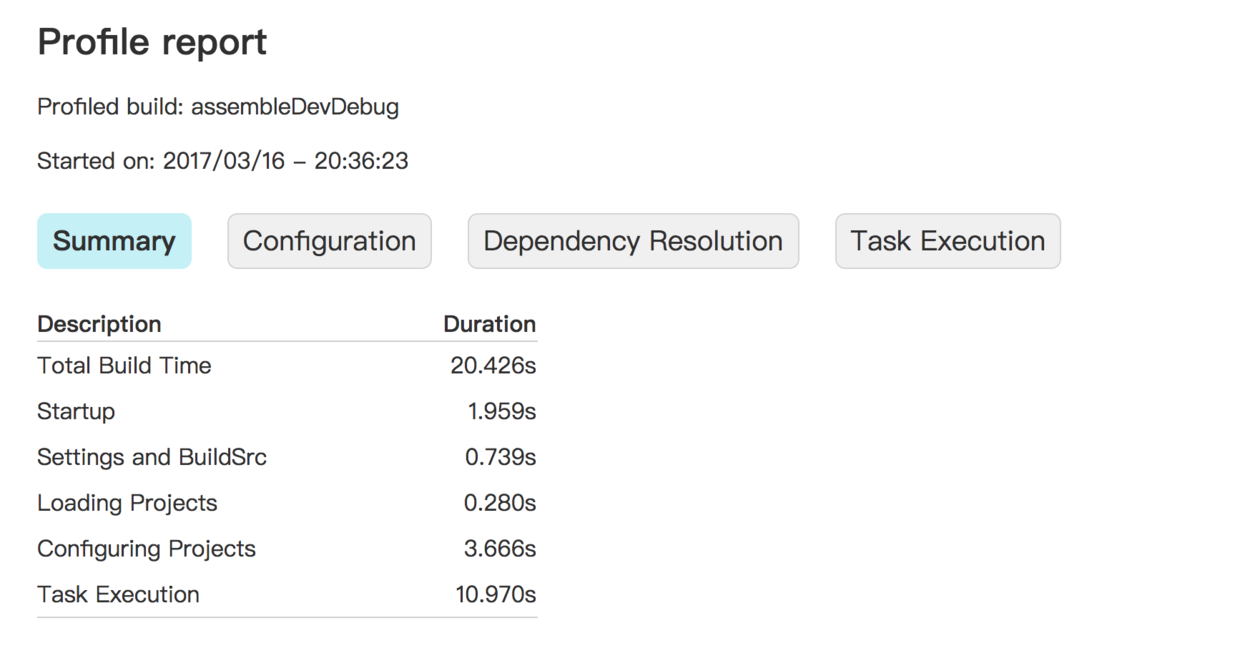 在大型的项目中(或者实现了大量自定义构建逻辑),可能需要更加深入的了解构建进程来寻找瓶颈,你可以通过分析构建生命周期的各个阶段 每个gradle task 执行了多长时间。例如:如果你的构建资料显示Gradle 花了大量的时间来配置你的工程,这建议你需要将自定义构建逻辑放在配置阶段之外。另外,如果mergeDevDebugResources 任务 消费了大量的的构建时间,这表明你需要将图片转换为WebP格式或者禁止PNG Crunching(第11,12 条优化建议)