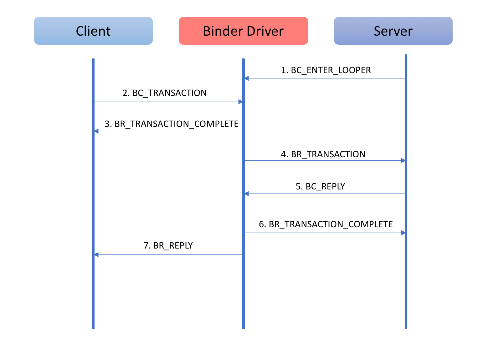 Client对于Server的请求会经由Binder框架由上至下传递到内核的Binder驱动中,请求中包含了Client将要调用的命令和参数。请求到了Binder驱动之后,在确定了服务的提供方之后,会再从下至上将请求传递给具体的服务。整个调用过程如下图所示: