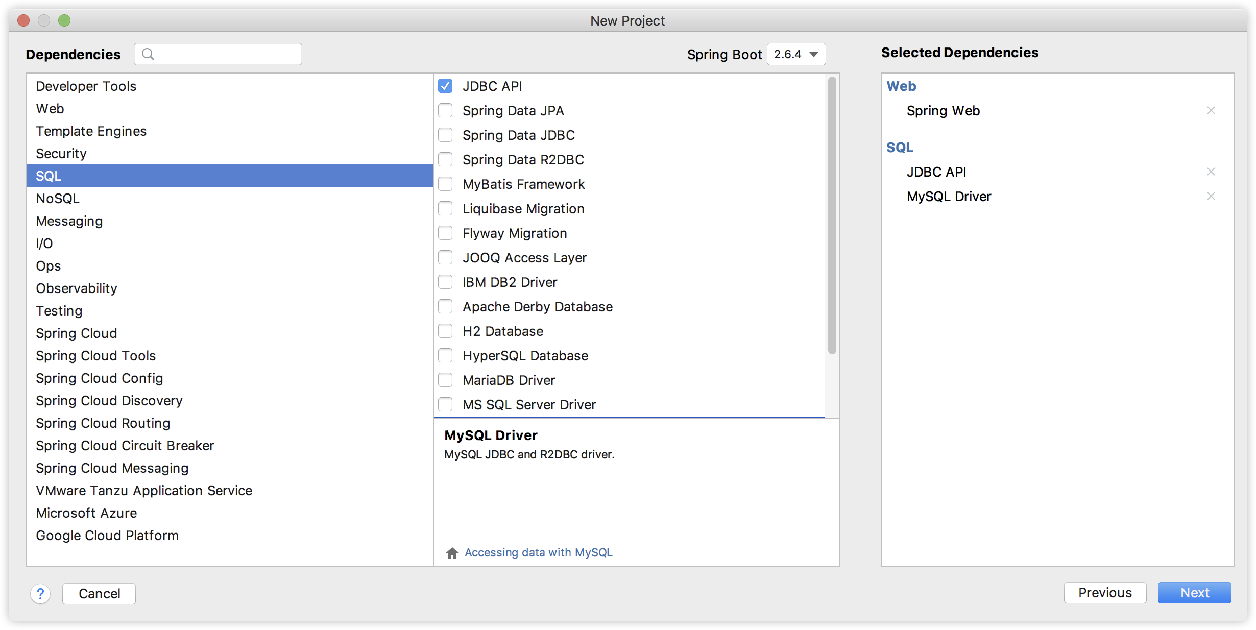 接下来我们创建一个 Spring Boot 项目,引入 Web、JDBC API 依赖和 MySQL 驱动,如下:
