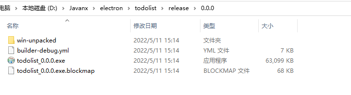 执行完后会生成两个目录:dist 和 release。dist 目录中生成的是前端打包文件,release 中生成的是electron 打包文件,内容如下: