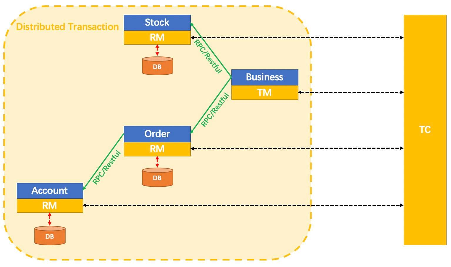 - TC (Transaction Coordinator) - 事务协调者:维护全局和分支事务的状态,驱动全局事务提交或回滚。