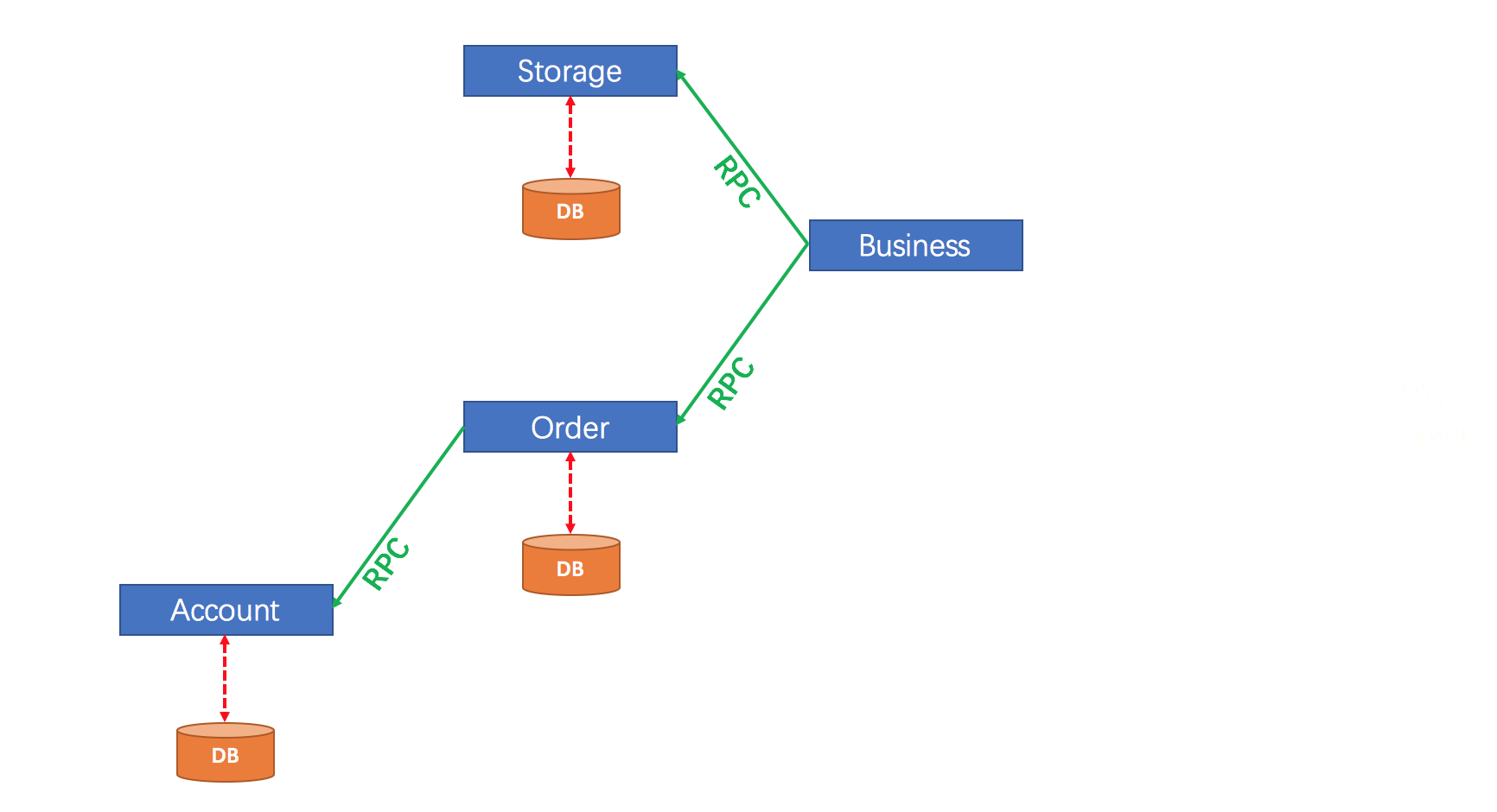 我们在 Business 中分别调用 Storage 与 Order、Account,这三个中的操作要同时成功或者同时失败,但是由于这三个分处于不同服务,因此我们只能先让这三个服务中的操作各自执行,三个服务中的事务各自执行就是两阶段中的第一阶段。