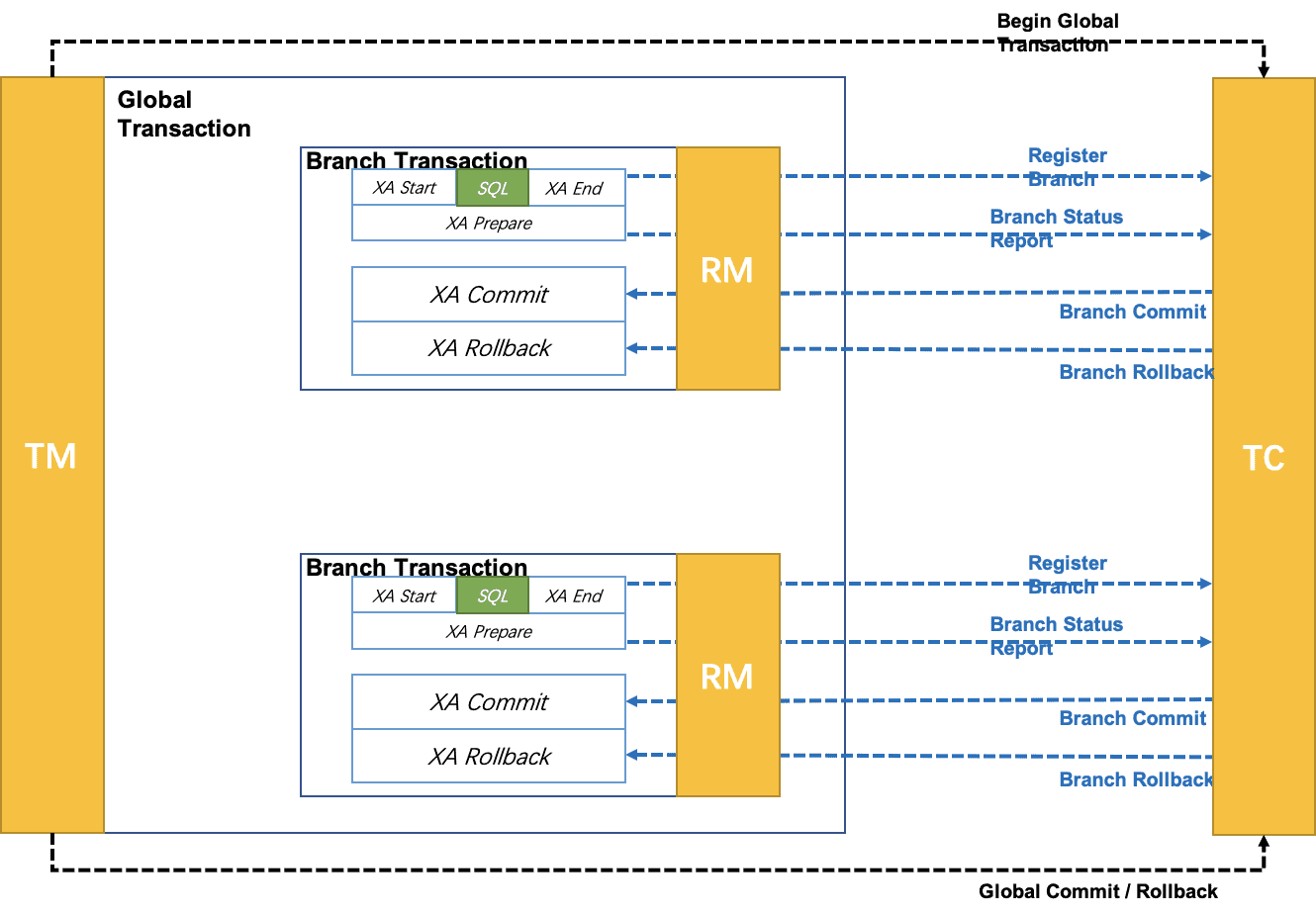 - TM (Transaction Manager) - 事务管理器:定义全局事务的范围,开始全局事务、提交或回滚全局事务。