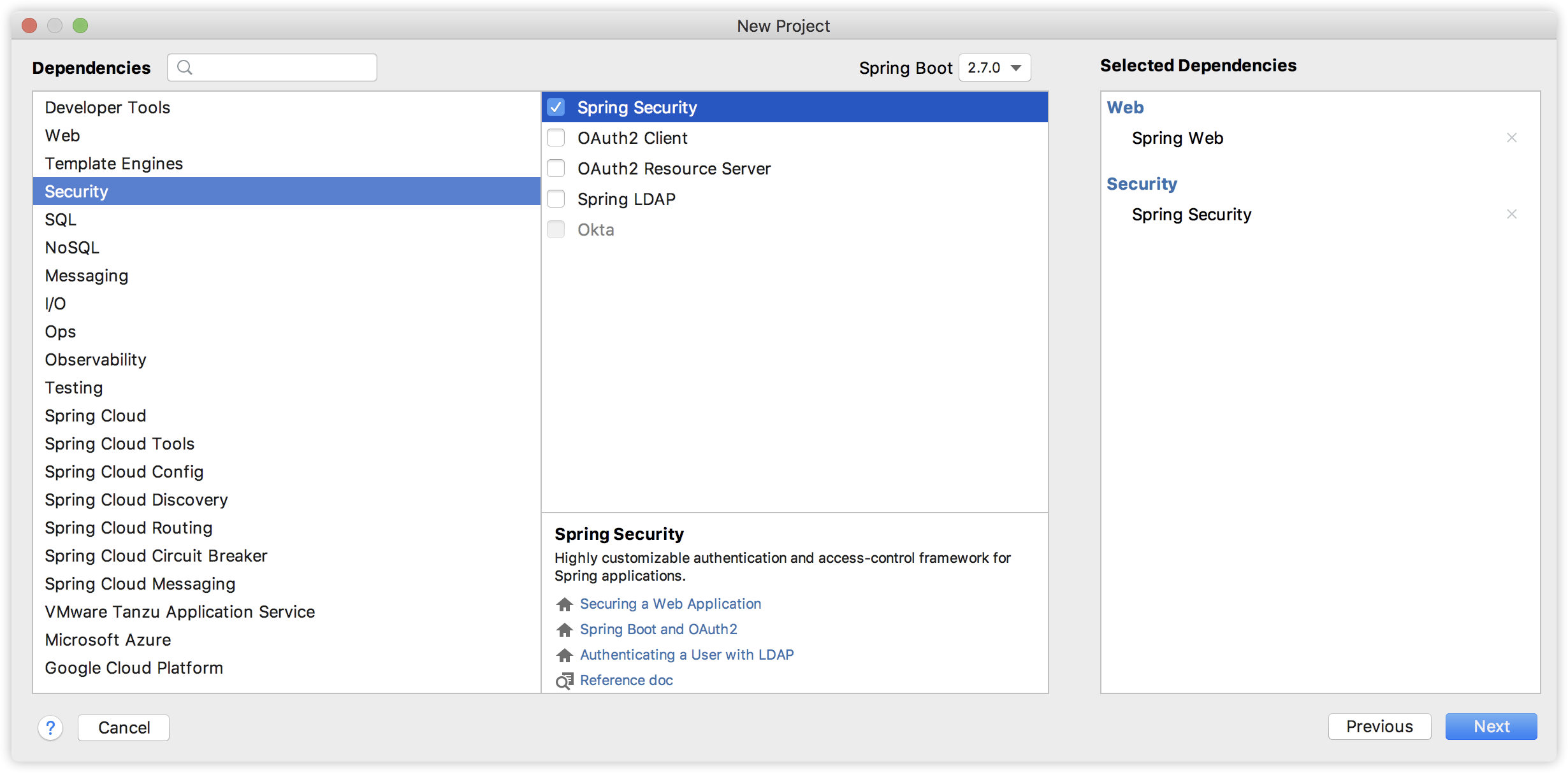 首先我们新建一个 Spring Boot 工程,引入 Web 和 Spring Security 依赖,注意 Spring Boot 选择最新的 2.7。