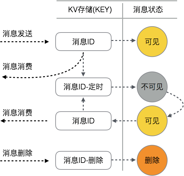 2、每条消息的实际消费者需要实时更新该模式的不可见时间;当消费者消费完成后,需要显示的删除该消息。