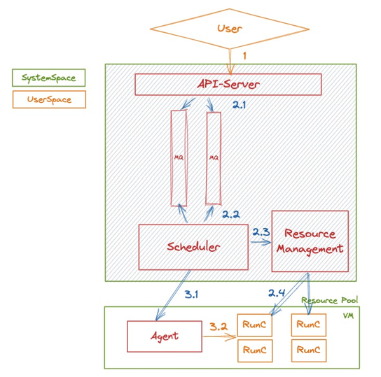 首先,用户调用函数计算 API 下发一个任务(步骤 1)进入系统的 API-Server 中,API-Server 进行校验后将消息传入内部队列(步骤 2.1)。后台有一个异步模块实时监听内部队列(步骤 2.2),之后调用资源管理模块获取运行时资源(步骤 2.2-2.3)。获取运行时资源后,调度模块将任务数据下发到 VM 级别的客户端中(步骤 3.1),并由客户端将任务转发至实际的用户运行资源(步骤 3.2)。为了做到上文中所提到的两个维度的保障,我们需要在以下层面进行支持:
