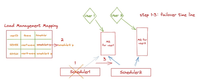 1、如果消息还未传递到用户的执行实例中(图 2 中的步骤 3.1 ~ 3.2),那么当这台 Scheduler 负责的队列被其他 Scheduler 拾起后,消息将在消费可见期后再次出现,因此 Scheduler 2 将再次获取该消息,做到后续的触发。