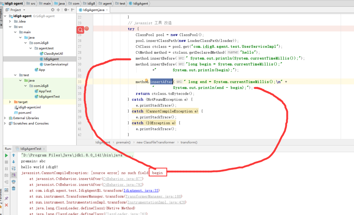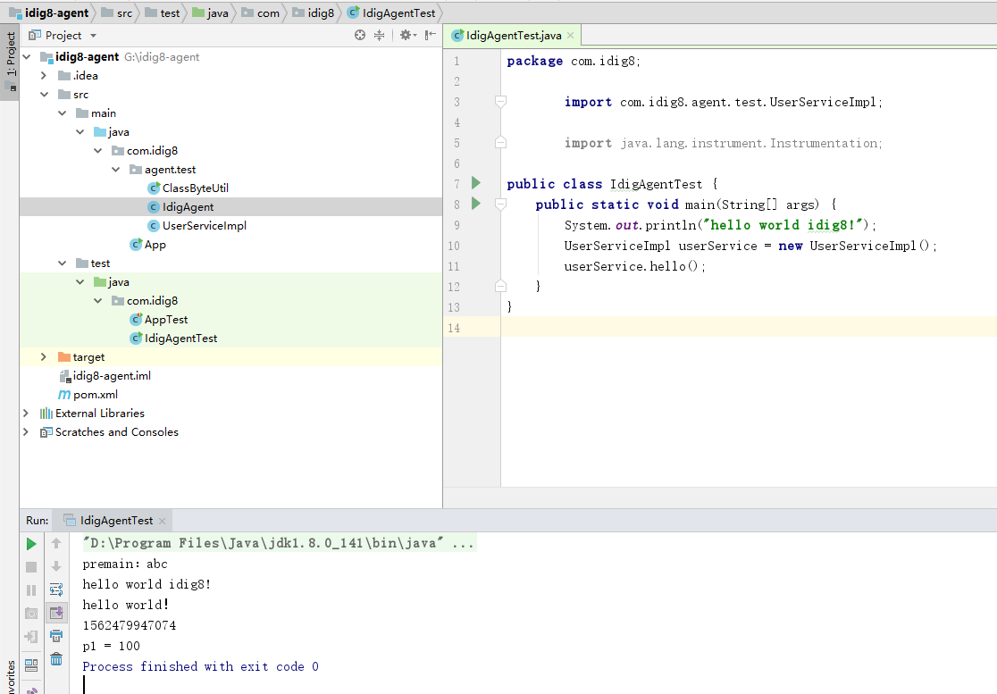 IdigAgent ->IdigAgentTest->UserServiceImpl的类->UserServiceImpl被插桩启动开始的hello-> 打印hello方法体